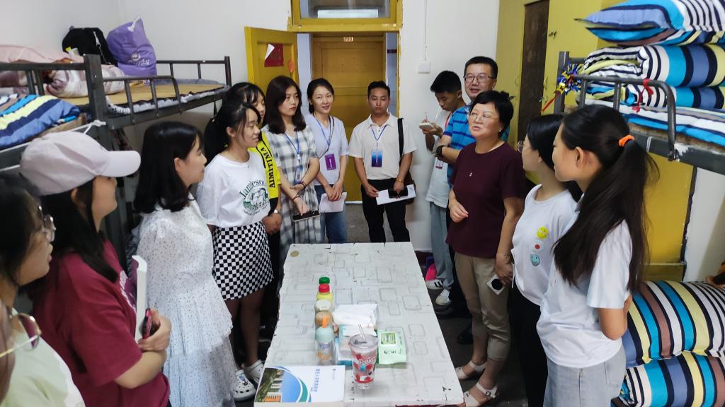 2021年9月9日下午六点,英国beat365官方网站党总支书记朱朝菊、党总支副书记潘维,学工办副主任崔宝玉,思想政治辅导员罗云及李苹老师一同走访2021级新生寝室。