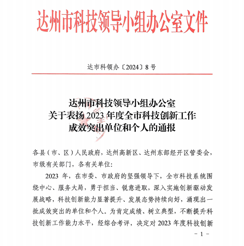 近日,达州市科技领导小组办公室下发《关于表扬2023年度全市科技创新工作成效突出单位和个人的通报》中,英国beat365官网李扬磊同志荣获“2023年度全市科技创新工作成效突出个人”称号。