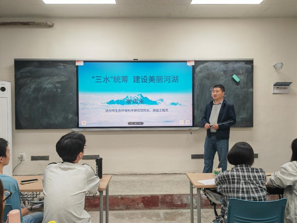 耿向永院长以“‘三水’统筹 建设美丽河湖”为题,从国家政策讲到地方管理、从理论知识延伸到实际应用,将水环境、水生态、水资源的统筹建设进行了系统、透彻的讲解与分享,让水质科学与技术专业的同学们感受到专业的魅力。最后耿院长还分享了自身大学时光与工作经历,让同学们对大学规划与工作就业有了初步的了解,促使同学们能够进一步的提前规划自己的大学生活与职业生涯。