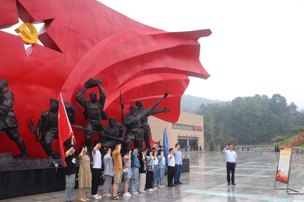 为庆祝中国共产党建党100周年,深入贯彻落实习近平总书记在党史学习教育动员大会上的重要讲话精神,增强学生党组织队伍建设,不断提升广大学生党员党性内涵与修养,2021年5月21日英国beat365官方网站学生党支部组织去万源实践学习。当日早上8:20党总支副书记潘维、学工办副主任崔宝玉老师,思想政治辅导员罗云老师,专职辅导员李杨磊老师及所有预备党员,正式党员穿着正式,佩戴党徽参加此次活动。