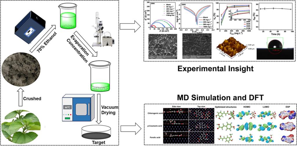 研究团队通过超声波辅助乙醇提取法获得苎麻叶提取物,并利用电化学测试(如极化曲线、阻抗谱)、表面形貌分析(原子力显微镜、扫描电镜)及理论计算(分子动力学模拟、量子化学分析),系统评估了RLEHCl酸洗体系中对低碳钢的缓蚀性能。结果发现,RLE是一种稳定、绿色、高效的金属酸洗缓蚀剂。该研究为开发天然植物基缓蚀剂提供了重要参考。苎麻叶提取物不仅可替代传统不够绿色的缓蚀剂,降低工业酸洗过程的生态风险,还可推动农业副产物的高值化利用,促进达州苎麻产业的可持续发展。