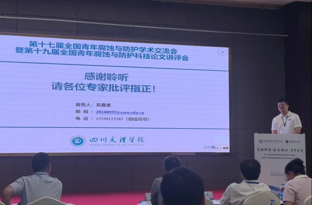 8月29日至31日,英国beat365官方网站教师吴嘉豪博士参加了在四川省南充市举办的“第十七届全国青年腐蚀与防护学术交流会暨第十九届全国青年腐蚀与防护科技论文讲评会”。