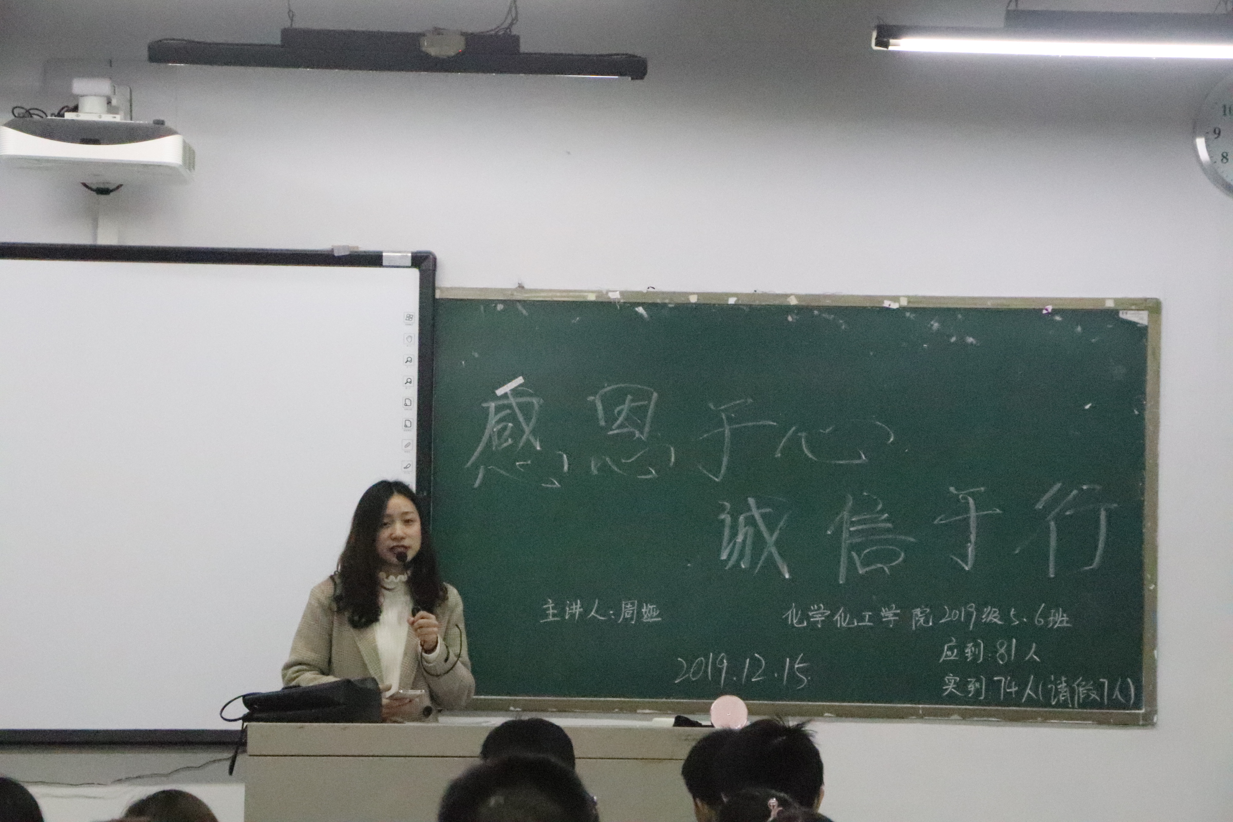 辅导员指出学生们要认真遵守学校关于考风考纪的各项规定,提高认识,端正态度,认真备考,杜绝考试违规、违纪的动机和行为。同时更希望每一名同学在人生的路上诚信考试,诚实做人,亮出真实的成绩,交出满意的答卷。辅导员强调作为一名大学生,不仅要学习专业知识,更重要的是还要具有良好的人格品质,一个人良好的品质之首是诚信,诚信考试更是学生的一个基本准则。感恩是当代社会着重强调的美德之一,学会感恩,对他人的帮助时时怀有感激之心,踏踏实实做事,使自己真正做一个有益于社会的人。班会中,辅导员提出受资助学生围绕“感恩”这一主题,通过书信形式抒发了他们浓厚的感激之情和个人今后的努力方向,这一行为教育引导了更多的同学学会感恩,珍惜机会,让他们时刻保持积极的心态,高标准要求自己,使他们全面发展。