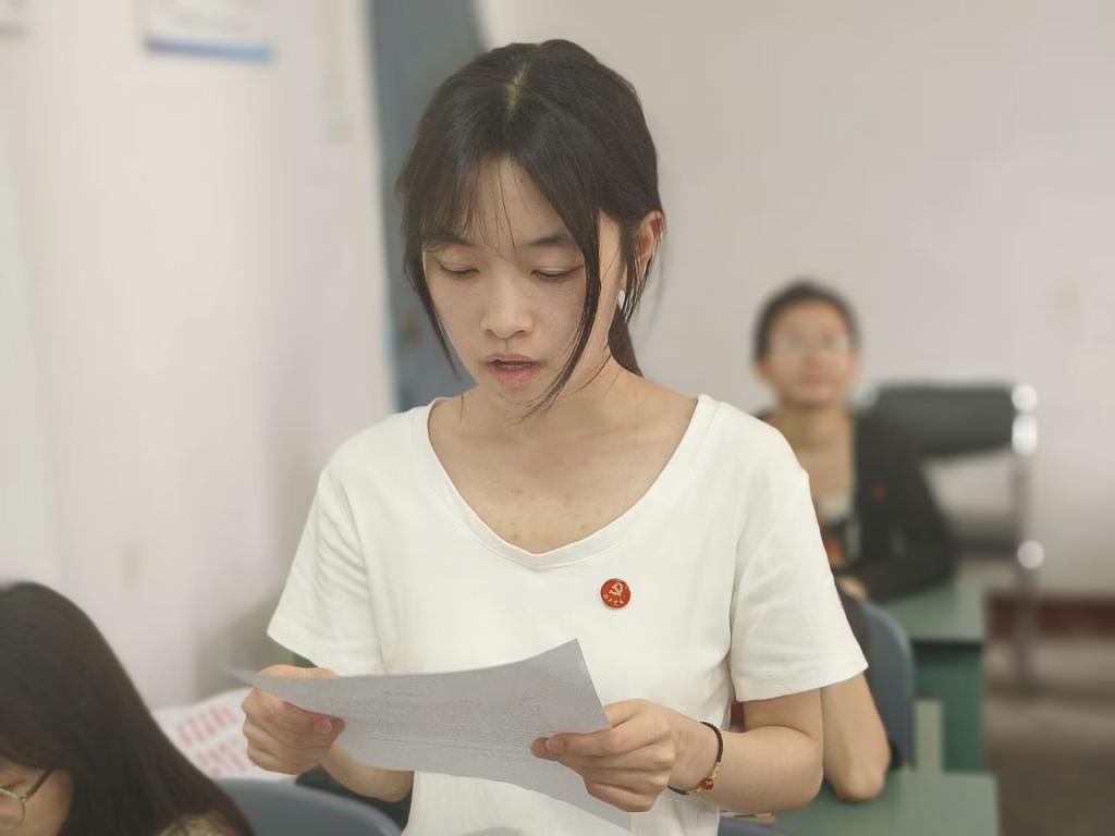 大会第二项,讨论是否吸收罗慧等7人为预备党员。会议严格按照“发展对象宣读入党志愿书、入党介绍人介绍考察表现情况并表态、支委委员代表支委会宣读发展对象的审查情况、全体党员发表意见、正式党员投票表决”等程序进行,大会氛围庄严肃穆,7名发展对象依次宣读了入党志愿书,汇报了自己在思想、工作、学习、生活等方面发展情况,随后培养联系人客观分析了每位同学在考察期间里的表现,并针对每位同学的不足提出了改进意见和建议。经过大会讨论、投票表决,罗慧等7名发展对象全票通过,被接收为中共预备党员。