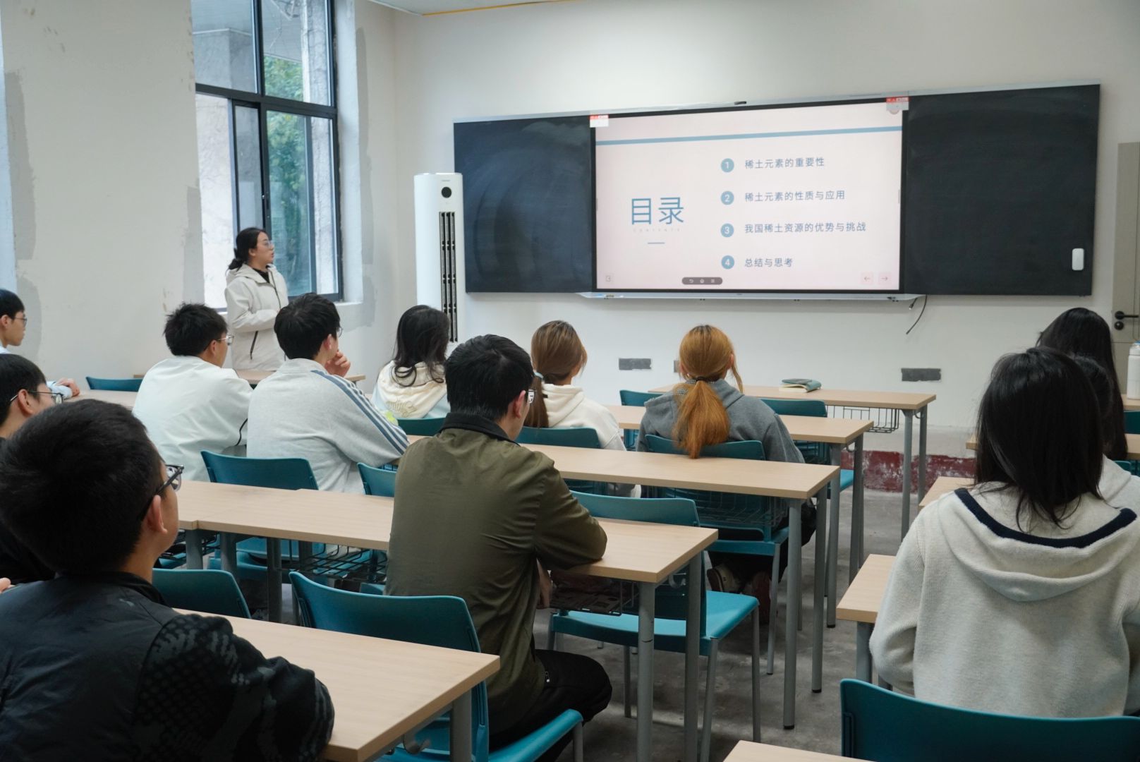 座谈会伊始,袁佳佳博士以专业视角切入,围绕稀土元素的核心物理化学性质和应用价值体系展开介绍。她通过条理清晰的讲解与案例剖析,梳理了稀土的定义范围与关键特性,深入阐明其在多个领域的不可替代作用。随后,袁博士进一步拓展议题,聚焦我国稀土资源的天然禀赋优势与产业发展所面临的现实挑战,结合行业数据与科研实践进行全面解读,既凸显了我国在稀土资源领域的核心竞争力,也客观分析了当下存在的潜在风险。座谈会期间设置了互动问答环节,现场氛围热烈活跃,同学们踊跃提出疑问,袁博士逐一细致解答,有效深化了同学们对稀土相关知识的理解与思考。