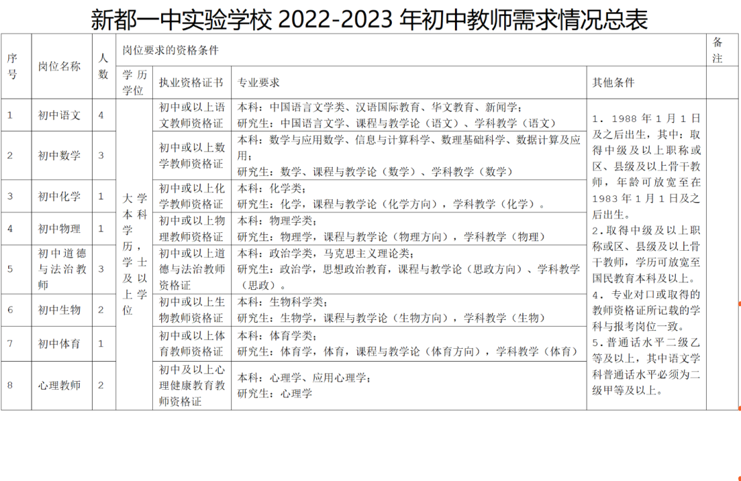 新都一中实验学校初中部2022-2023年初中教师需求情况总表.docx